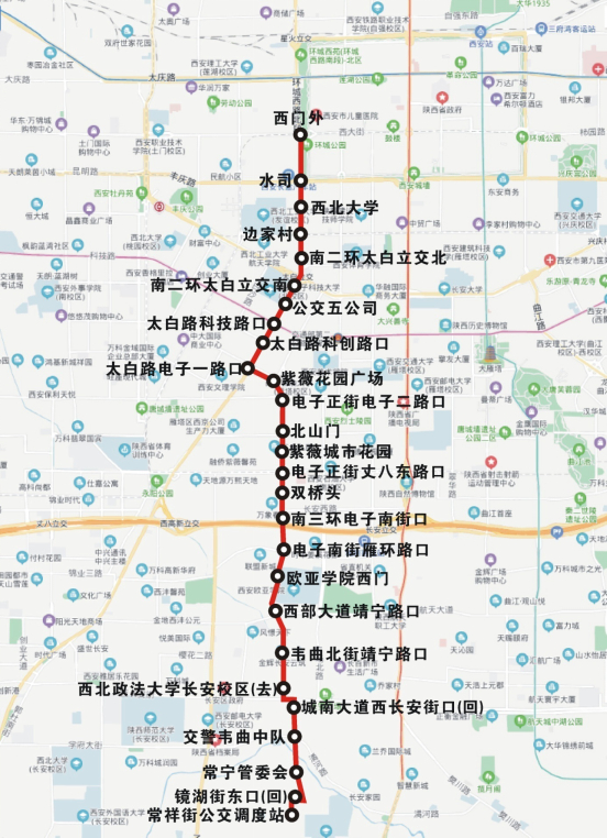 新增站点11个:常祥街公交调度站、锦湖街东口(回)、常宁管委会、交警韦曲中队、西北政法大学长安校区(去)、城南大道西长安街口(回)、韦曲北街靖宁路口、西部大道靖宁路口、欧亚学院西门、电子南街雁环路口、南三环电子南街口。