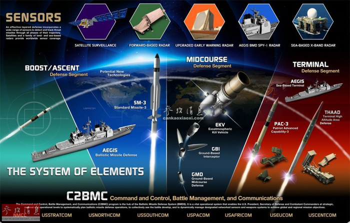 由于飞行弹道不同于常规洲际弹道导弹(飞行弹道相对固定,易于预测和拦截),美军现役部署在阿拉斯加州的“地基中段拦截弹”(GMD)系统及本土的“萨德”高空战区拦截系统,尚无法防御俄军“先锋”这类的HGV武器。图为美军现役反导体系示意图,其中GMD和“萨德”是本土反导主力。