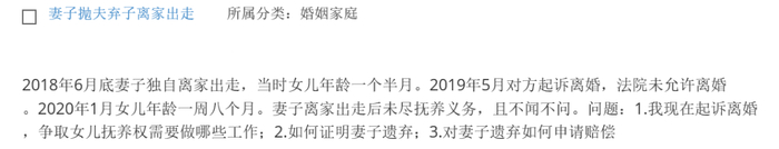 二、妻子离家出走后未尽抚养义务,不一定构成遗弃。你可以搜集相关证据证明其未尽抚养义务的行为,比如:1.与妻子的联系记录,不回信息不接电话的行为也是证据;2.邻居的证人证言,证明妻子离家走出后一直都是你在照顾女儿;3.社区的证人证言及其他能够证明妻子有长时间不照顾女儿的行为的证据。若搜集的证据足以认定遗弃,根据《婚姻法》第四十六条第四款的规定,遗弃家庭成员导致离婚的可以要求损害赔偿,你作为孩子的监护人可以据此依法主张赔偿。