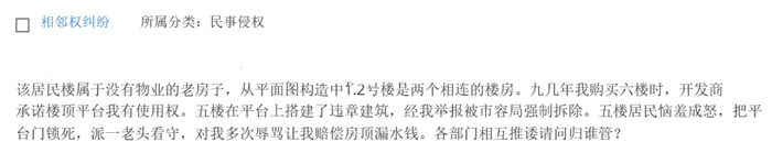 居民楼属于没有物业的老房子,从平面图构造中1、2号楼是两个相连的楼房。我购买六楼时,开发商承诺楼顶平台我有使用权。五楼在平台上搭建了违章建筑,经我举报强制拆除。五楼居民恼羞成怒,把平台门锁死,派一老人看守,对我多次辱骂并让我赔偿房顶漏水钱。我该怎么办?