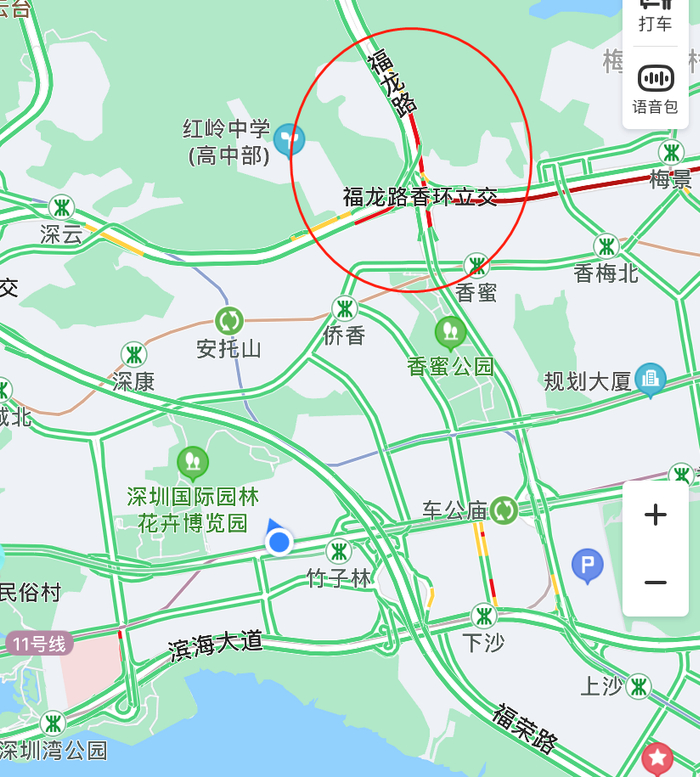 高峰时段,福龙路等主要联系道路交通拥堵严重,从地图上看都是一片红红红…