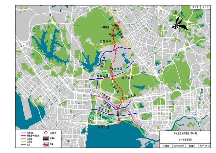 侨城东路北延通道工程,北起福龙路,往南下穿阳台山后,与规划宝鹏通道、沙河东路北延道路、北环大道、滨海大道衔接;