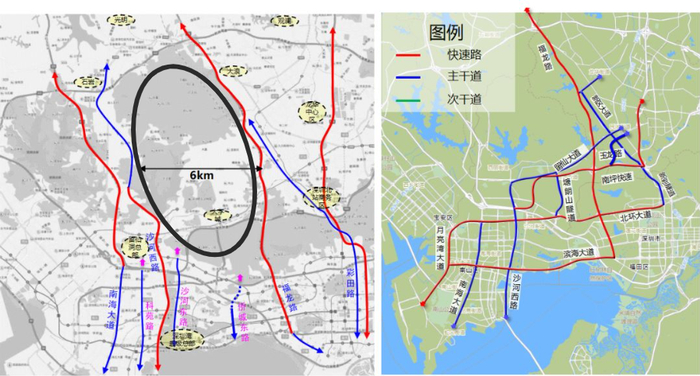深圳中西部多山体、水库,因此,当前的市域快速路具有明显的“东西发达、南北稀疏”的特点。