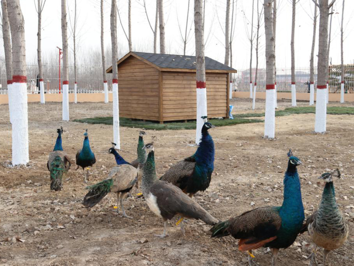 依托公园内原有地形与树木,昝岗镇精心设计、巧妙构思,在原有一圈方形水泥基座上加装了一米多高的不锈钢栏杆,经过平整土地、铺设草坪、修建笼舍等一系列改造之后,建设完成了孔雀园,10只蓝孔雀就在此安家。