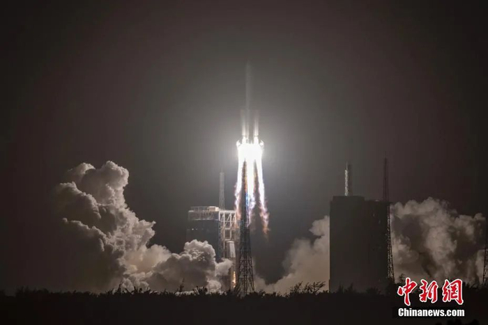 11月24日凌晨,嫦娥五号成功发射。中新社记者 骆云飞 摄之后,嫦娥五号探测器实施2次轨道修正、2次近月制动,顺利进入环月圆轨道。