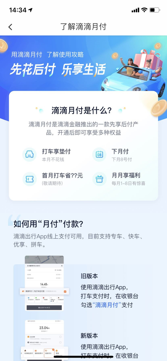 滴滴方面告诉第一财经,滴滴月付产品是滴滴金融近期尝试性推出的一款先享后付的信用支付产品,用户开通后,可用于支付滴滴平台上的出行服务费用。