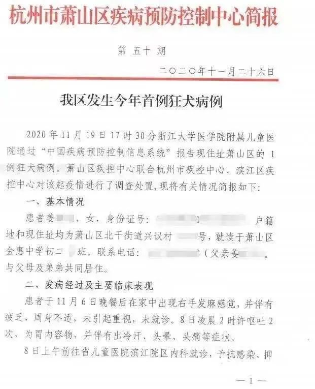 11月26日,杭州市萧山区疾病预防控制中心通报萧山区今年首起狂犬病例,称姜某某家今年3月曾从外捡回一只流浪狗,因4月该犬出现乱咬犬笼等异常情况,持续约2天后,将该犬丢弃,不知去向。家属否认姜某某曾被该犬致伤。