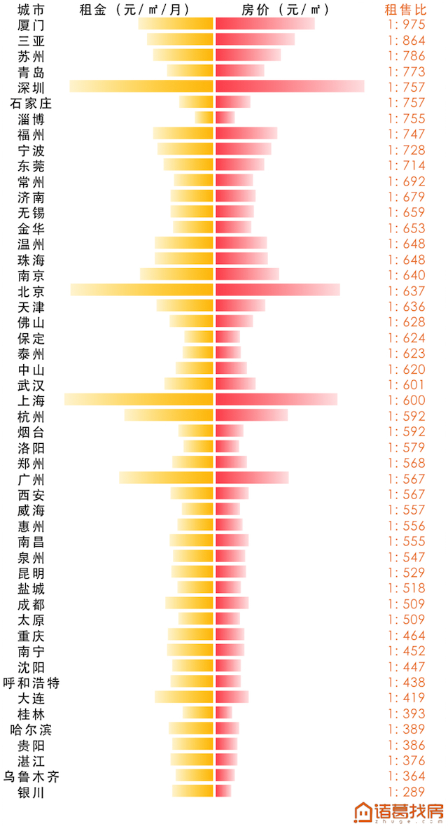 而经济发展水平更高的沿海地区反倒面临低租售比的困扰。根据《报告》,低租售比排名前十的城市,集中分布于环渤海、长三角、珠三角经济圈的二线和三四线城市,其中,厦门以1:975成为租售比最低城市,其次为三亚和苏州,租售比分别为1:864和1:786。