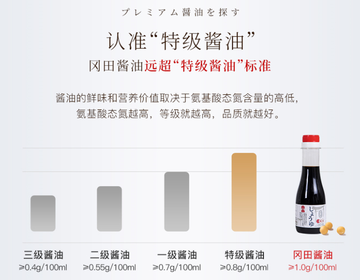 而这瓶冈田酱油,氨基酸态氮含量为1.0g/100ml,远超国家特级标准的高品质酱油。