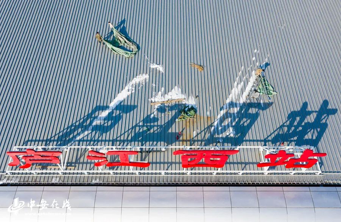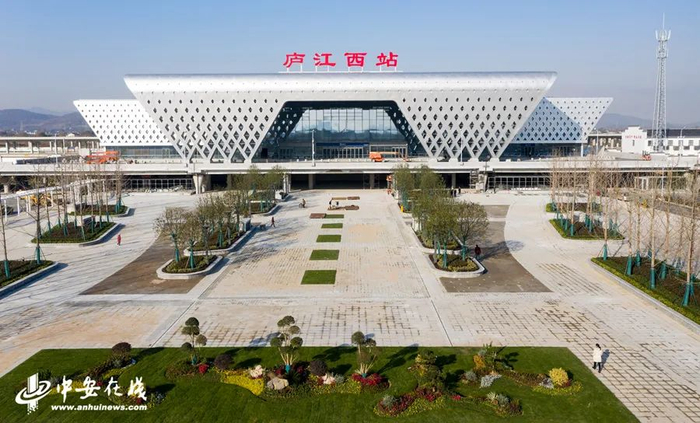 庐江西站以“时代新颜,腾飞庐江”为主题,以现代、新颖、科技感等特征为出发点,勾勒出具有时代感的现代高铁车站形象。