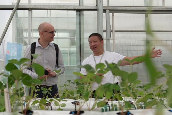 ▲程飚(右一)向荷兰骑士集团亚太区总裁Fulco Wijdooge(左一)介绍智多莓队的草莓生长智慧决策系统。(摄影:穆功)