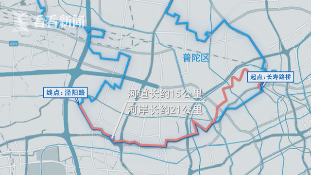 普陀区内苏州河东起长寿路桥,西至泾阳路,河道长度约15公里,岸线全长约21公里,其岸线长度占市区段苏州河总长的50%。