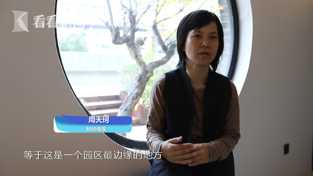 M50商家周天珂称:“当时我们把后场空间租下来的时候,等于是一个园区最边缘的地方。后来人行步道就做过来了。我们去年年底的时候,进行了自己空间的二次装修升级,在这次升级的过程当中,我们就已经把我们后面这个面向考虑成了是我们的一个非常重要入口,生活在附近的很多的居民。之前是不知道M50的,就是因为有了这个步道,就散步、跑步,跑跑跑 发现,这里还有一个这么棒的空间。”