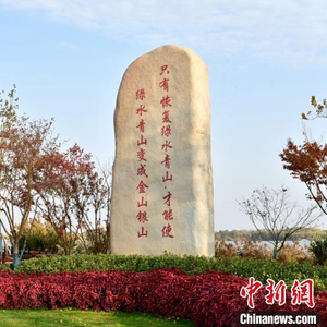 潘安湖西畔神农码头巨石上催人奋进的话语。 朱志庚 摄