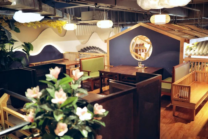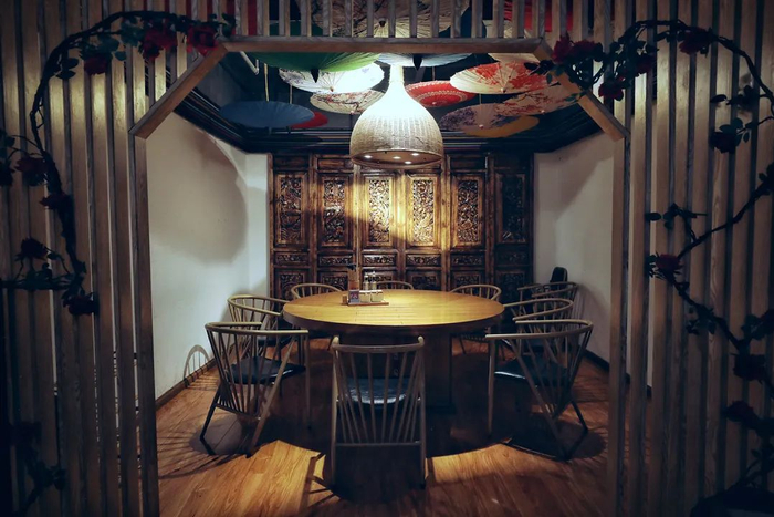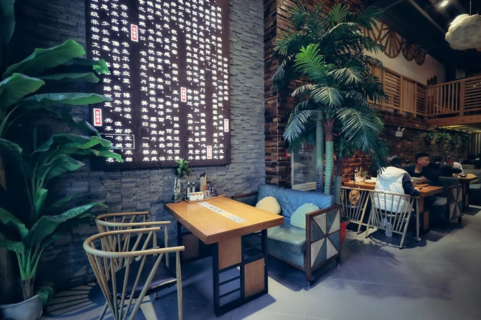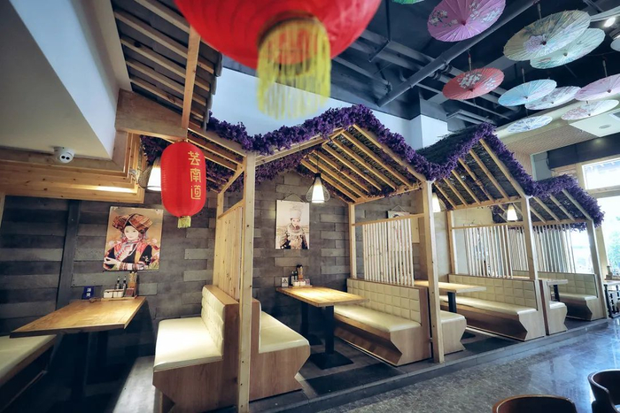 全店共有800多平方米,集云南文化与民族特色于一体,青砖瓦黛、高山绿水、祥云蓝天、民族歌舞……墙上少数民族风情的装饰,复古怀旧的桌椅,颇具特色。