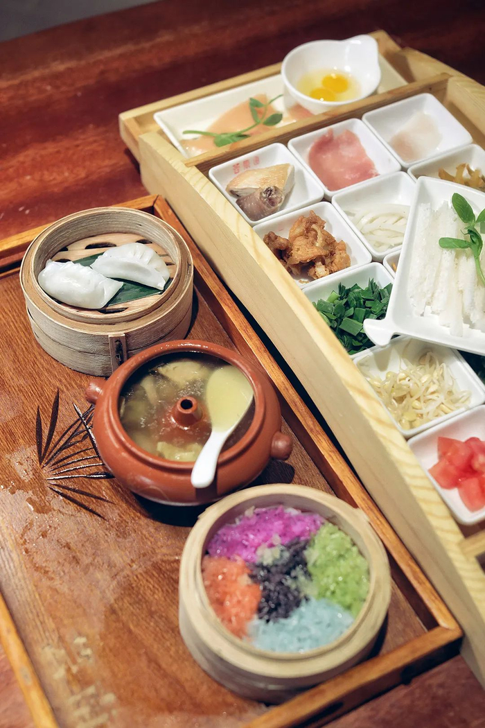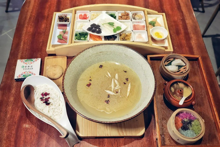 除了过桥米线以外,套餐内还会配有:汽锅鸡、五彩花米饭、汽锅鸡、玫瑰鲜花饼、松茸水晶饺,每一口都是熟悉的味道,深受食客追捧。