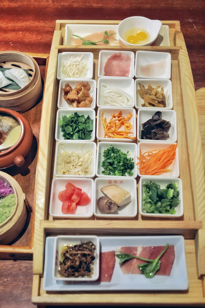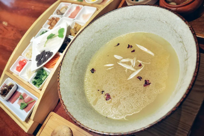 光是看这个碗就已经够诚意满满,一份比脸盆还大,配菜方面除了经典的基本搭配以外,还加上了云南特有的竹笋、松露,多达22种,不禁感叹原来吃过桥米线也可以那么讲究。