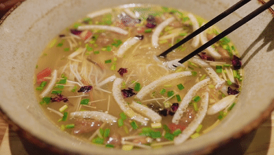 在高汤上,坚持过桥米线百年传统熬汤方法,每天早上5点开始,都是当天熬制而成。