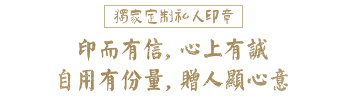 默认白文、字体为繁方篆,可以像名人般定制自己的私人印章,尽显风雅,也能定制闲章,赠予亲友,略表心意。