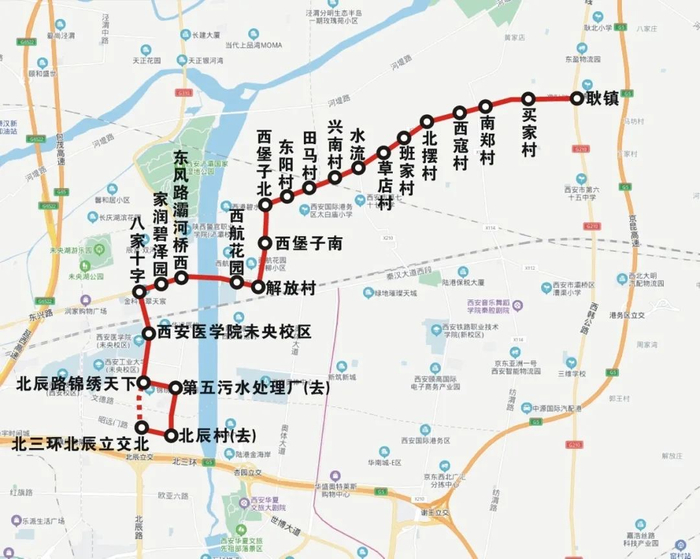 线路设置站点23个:耿镇、买家村、南郑村、西寇村、北摆村、班家村、草店村、水流、兴南村、田马村、东阳村、西堡子北、西堡子南、解放村、西航花园、东风路灞河桥西、家润碧泽园、八家十字、西安医学院未央校区、北辰路锦绣天下、第五污水处理厂(去)、北辰村(去)、北三环北辰立交北。