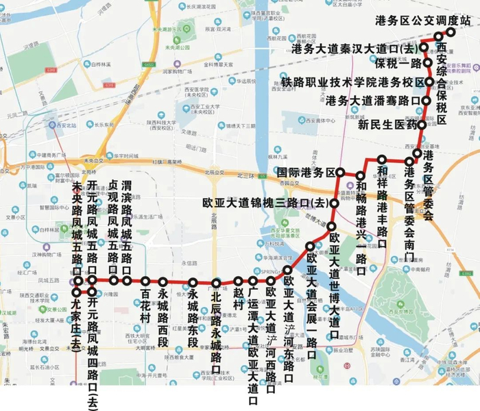 线路设置站点29个:港务区公交调度站、西安综合保税区、港务大道秦汉大道口(去)、保税一路、铁路职业技术学院港务校区、港务大道潘骞路口、新民生医药、港务区管委会、港务区管委会南门、和祥路港丰路口、和畅路港兴一路口、国际港务区、欧亚大道锦槐三路口(去)、欧亚大道世博大道口、欧亚大道会展一路口、欧亚大道浐河东路口、欧亚大道浐河西路口、广运潭大道欧亚大道口、赵村、北辰路永城路口、永城路东段、永城路西段、百花村、渭滨路凤城五路口、贞观路凤城五路口、开元路凤城五路口、开元路凤城四路口(去)、尤家庄(去)、未央路凤城五路口。