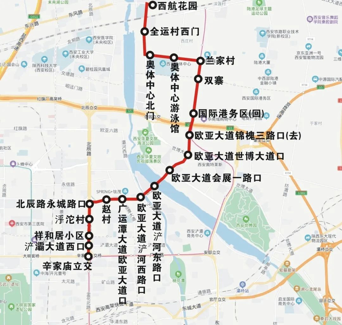 线路设置站点19个:西航花园、全运村西门、奥体中心北门、奥体中心游泳馆、兰家村、双寨、国际港务区(回)、欧亚大道锦槐三路口(去)、欧亚大道世博大道口、欧亚大道会展一路口、欧亚大道浐河东路口、欧亚大道浐河西路口、广运潭大道欧亚大道口、赵村、北辰路永城路口、泘沱村、祥和居小区、浐灞大道西口、辛家庙立交。