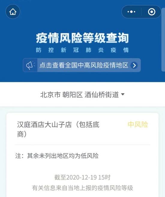 在12月19日的新闻发布会上,庞星火介绍,根据国务院应对新冠肺炎疫情联防联控机制有关要求和北京市疫情防控形势,按照科学划定、精准管控原则,经专家评估和北京疫情防控工作领导小组研究决定,自2020年12月19日起将朝阳区汉庭酒店大山子店(包括底商)划定为中风险地区,北京市其他区域风险等级不变。