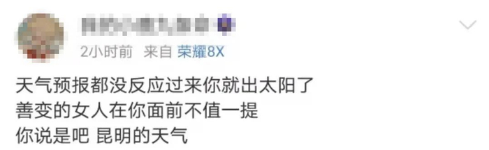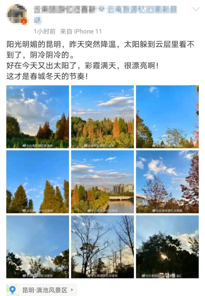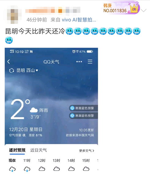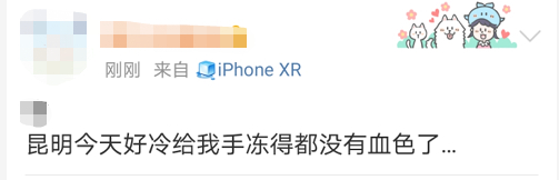 微博上有网友表示,“昆明今天比昨天还冷”。