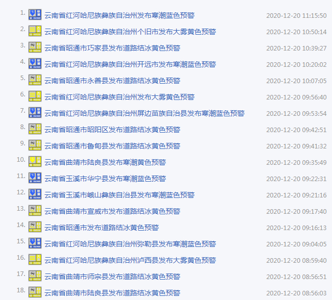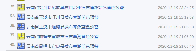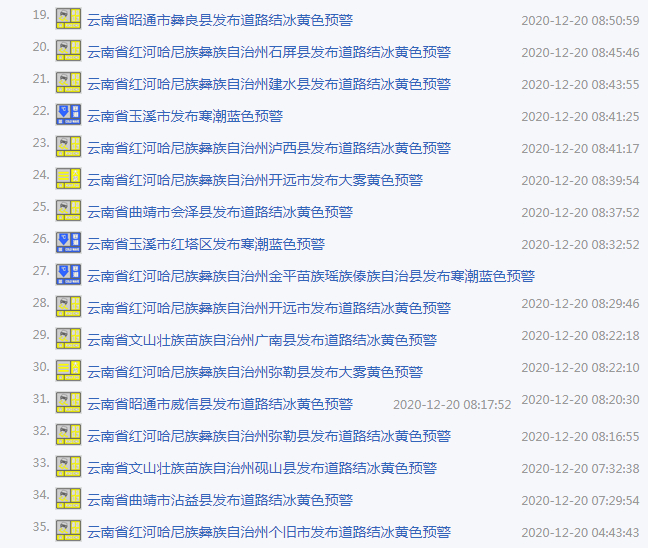 据中国天气网的消息,从昨晚到今天上午,云南各地连发多条寒潮、道路结冰预警,仅今天上午就发了35条。