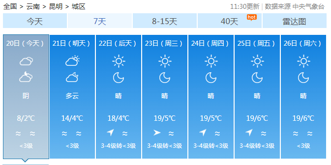 据天气预报显示,明天昆明将回暖升温,最高气温将到14℃,周二又将是大晴天!小伙伴们,坚持住哦~