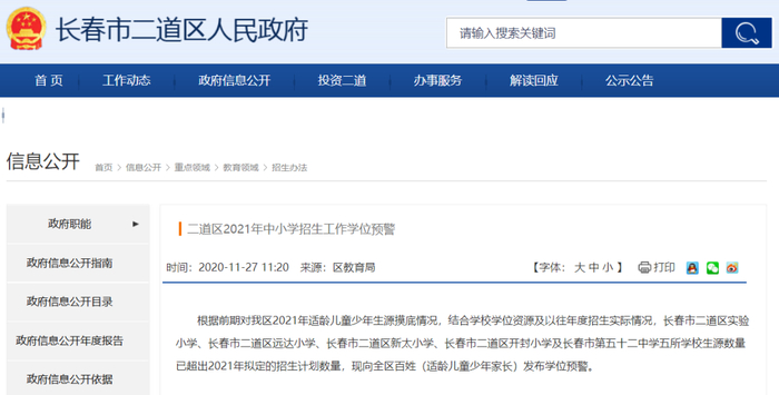 根据前期对我区2021年适龄儿童少年生源摸底情况,结合学校学位资源及以往年度招生实际情况,长春市二道区实验小学、长春市二道区远达小学、长春市二道区新太小学、长春市二道区开封小学及长春市第五十二中学五所学校生源数量已超出2021年拟定的招生计划数量,现向全区百姓(适龄儿童少年家长)发布学位预警。