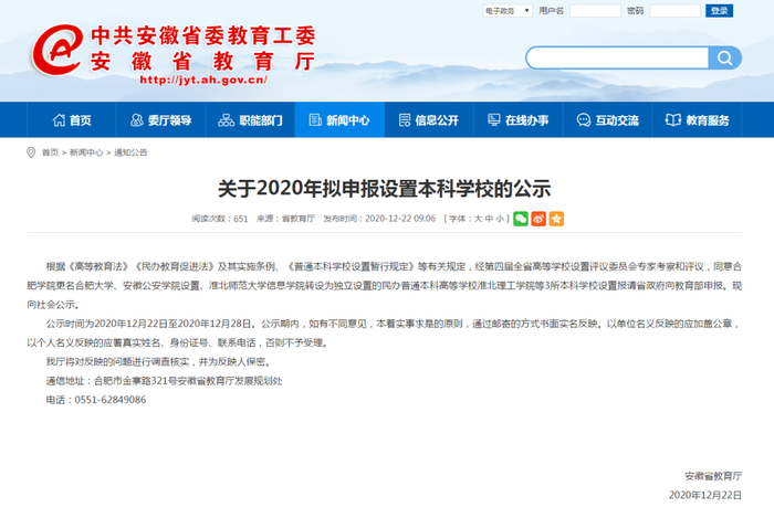 12月22日,教育厅在其官网上发布了《关于2020年拟申报设置本科学校的公示》,同意合肥学院更名合肥大学、安徽公安学院设置、淮北师范大学信息学院转设为独立设置的民办普通本科高等学校淮北理工学院等3所本科学校设置报请省政府向教育部申报。