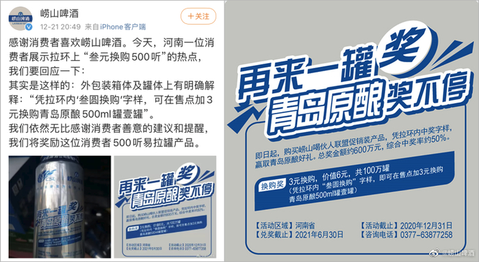 12月20日,河南南阳的李先生在饭店吃饭时,发现买的崂山啤酒中奖了,中奖信息显示“3元换购青岛原酿500听”。当时,李先生看到,活动截止到6月30日。