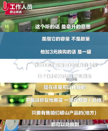 而崂山啤酒相关人员回应称,换购青岛原酿500听是指500毫升,不是指500罐,“这个活动目前没有过期,只要有售崂山啤酒产品的地方都可以兑换。”