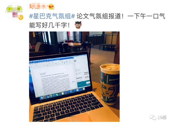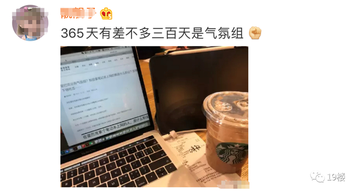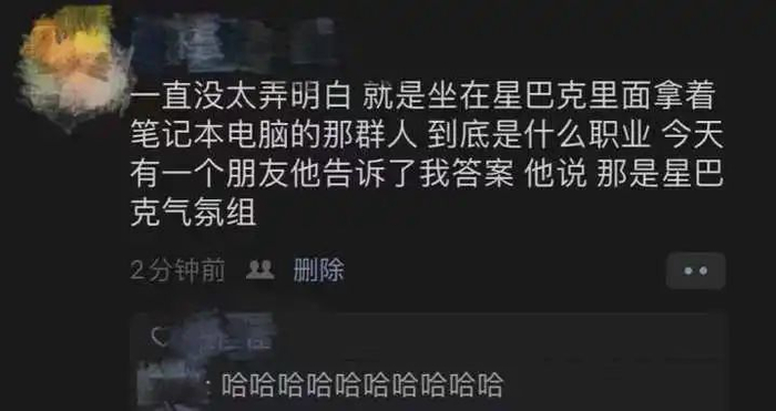 “一直没太弄明白,就是坐在星巴克里面拿着笔记本电脑的那群人到底是什么职业,昨天有一个朋友告诉了我答案,他说,那是星巴克气氛组”。