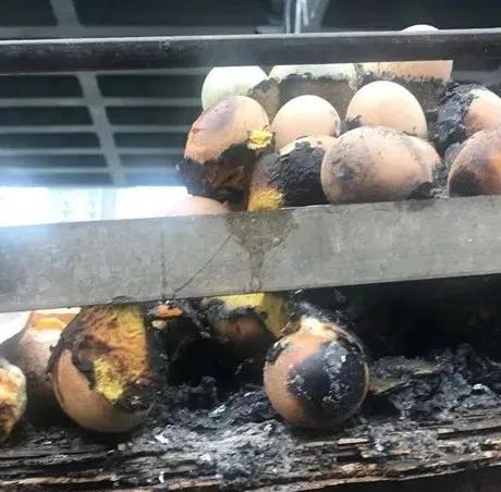 三轮车顶层放置了不少鸡蛋,已被烤熟。消防员灭火后,对烧毁的隔音板进行检查,防止发生复燃。