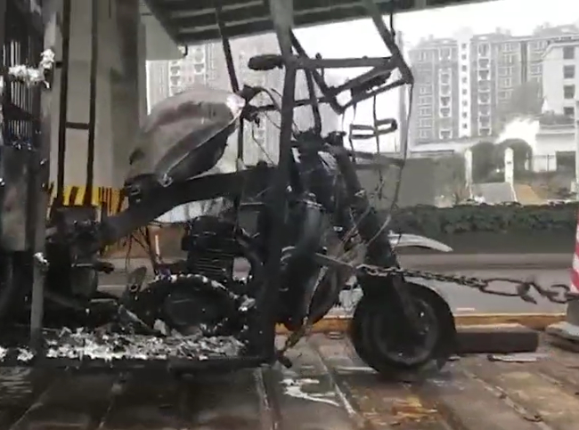 现场,三轮车前部受损严重,疑似线路老化引发火灾;两块隔音板被烧毁,路边墙体也被熏黑。