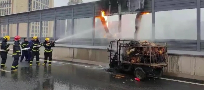 起火的三轮车后面是两层铁笼,里面装着数十只活鸡和几只活鸭。