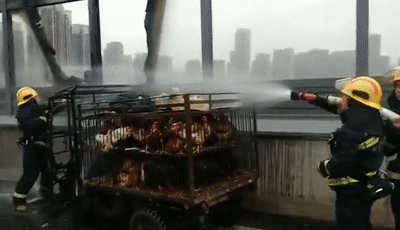 火灾事故发生后,车主也不知所措,眼看着一车活鸡就要变“火鸡”。