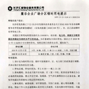 该通知称:“根据高新区经发局通知:麓谷企业广场限定用电负荷4000KVA,而全园全部企业用电所需负荷为15000KVA,为尽量避免全园区停电,服务中心拟定于2020年12月15日开始执行分区错时用电,停电时间为早上8:00到晚上21:00。”