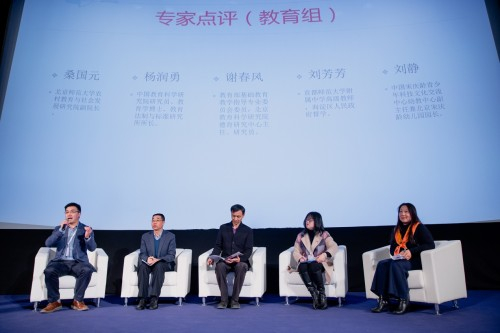 接下来,在场的15位专家根据专业领域分成教育、人文艺术、出版三组,一组组地对两次演讲进行点评和充分对话,探讨话题越来越深入和拓展。教育组的五位专家主要探讨美育创作与现今教育系统的结合问题。北京师范大学教育学部教授桑国元分享了“基于项目的学习模式”(Project-based learning),建议让孩子成为美育创作的主角,在其中提升人文素养和创造性。中国教育科学研究院研究员杨润勇给出整合美育资源、形成课程体系、融入德育系统的建议。教育部基础教育教学指导专业委员会委员、北京教育科学研究院德育研究中心主任谢春风主任沉痛地说起四年级女孩跳楼的悲剧,指出“现代社会在引导孩子认识生之美方面已经到了刻不容缓的地步”。首都师范大学附属中学高级教师刘芳芳建议在美育作品研发阶段让更多学者、专家、一线教师都能融入。北京宋庆龄幼儿园园长刘静则分享了在实际的幼儿园美育工作中的做法和经验。
