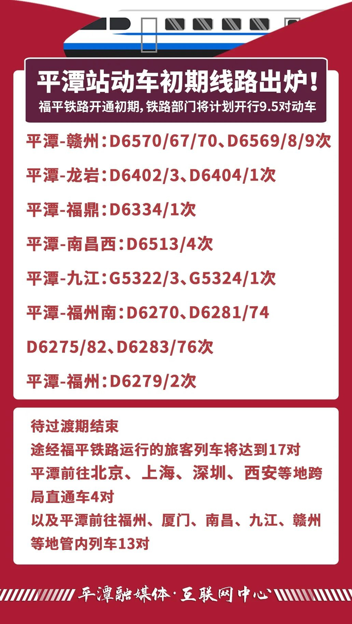 在开通初期,途经福平铁路运行的旅客列车计划开行9.5对动车,待过渡期结束将达到17对。