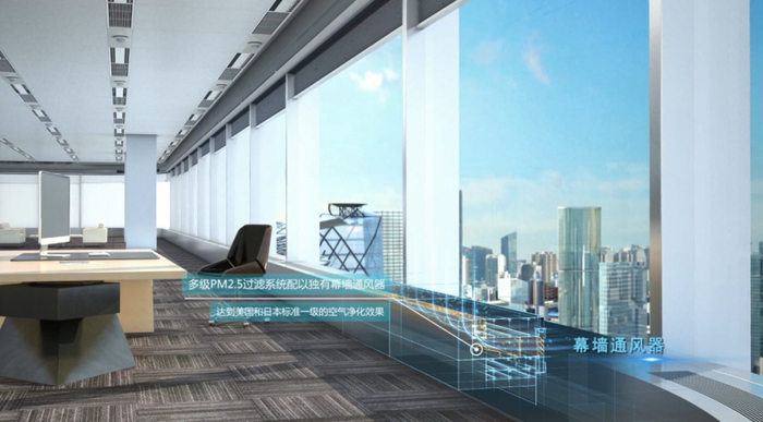 整体建筑地上45层、地下6层,配备了定制幕墙通风器,通过调节室外新风,实现高层建筑无能耗自然通风,在封闭环境里有效提升空气清洁度,排出室内浊气及蓄热。