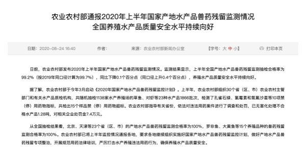 记者在农业农村部官网查到了上半年国家产地水产品兽药残留监测情况。监测结果显示,养殖水产品质量安全水平持续向好。上半年共随机抽检1138家水产养殖场的草鱼、对虾等23种水产品1866批次,检测了孔雀石绿、氯霉素和氧氟沙星等10项禁(停)用药物指标,共检出15个样品禁(停)用药物超标。从全国抽检结果看,北京、天津等23个省(区、市)的产地水产品兽药残留监测合格率为100%,罗非鱼、大黄鱼等15个养殖品种的兽药残留监测合格率为100%。
