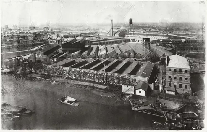 中国第一家制造整套棉纺织机器的专业工厂大隆机器厂。图为该厂迁至苏州河畔光复西路后的全厂面貌(资料图)。