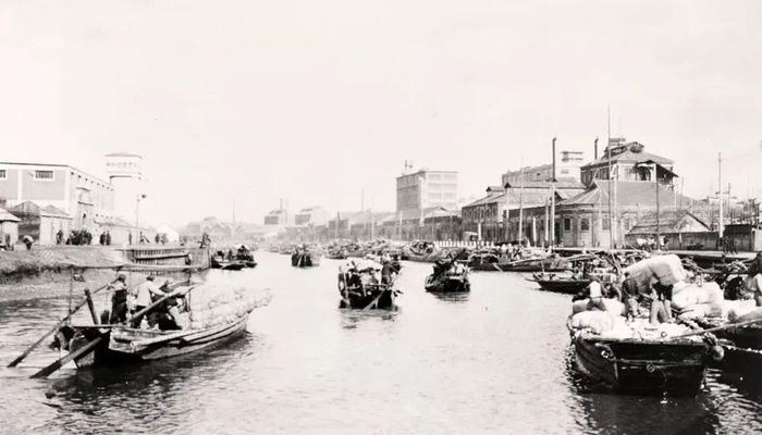 20世纪20年代苏州河影像,现大致梦清园河段。可见两岸可见工厂码头仓库众多(资料图)。