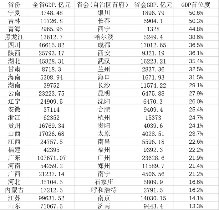 从各个省会城市的GDP首位度即省会城市GDP占全省的比重来看,2019年,首位度最高的10个省会城市(自治区首府)分别是银川、长春、西宁、哈尔滨、成都、西安、武汉、兰州、海口和长沙。其中前九个城市占比都超过了30%,银川和长春超过了50%。