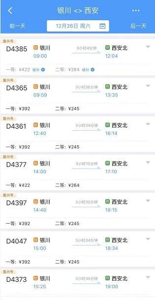 开通后,银川至西安北最短运行时间3小时04分,西安北至银川最短运行时间3小时05分。庆阳至西安北最短运行时间1小时16分,西安北至庆阳最短运行时间1小时22分钟。目前,根据12306网站显示,银西高铁车票开始发售。具体票价和运行时刻看下图↓