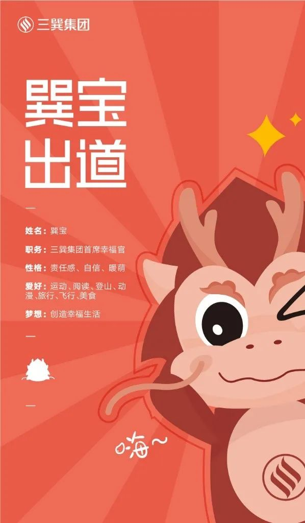 “巽宝”可盐可甜,可萌可酷,有知识会玩耍,责任感满值,最大的心愿和使命便是为每一个三巽家庭带来幸福,“创造幸福生活”是它的人生格言。这也是三巽集团为其打造的讨喜“龙”设。