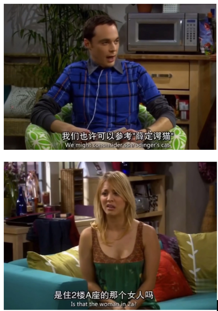 图:《生活大爆炸》中,Sheldon讲“薛定谔的猫”,让Penny发懵。